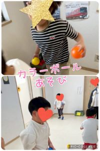 カラーボール遊びではみんなでカラーボールを色分けしてかごにいれていくなど、ゲーム形式で取り組んでいきました。