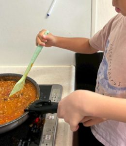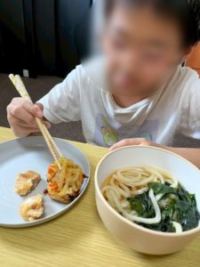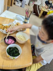 トングで挟んで、ひっくり返したり、お箸でつまんでお皿に移したり、がんばってくれました。お料理しながら、お箸やトングもたくさん練習できました😊