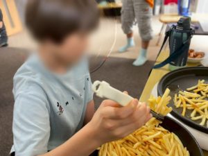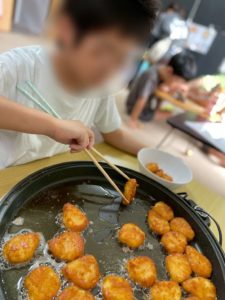 トングや箸を使って、ホットプレートに気を付けながら、揚げ焼きしました。