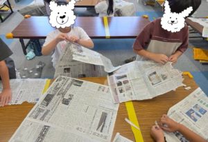 ソアレの子と児童クラブの子たちが4~6人のチームを作り、一枚の新聞紙を小さく破っていきどれだけ長くすることができるか、長さを競っていきました。