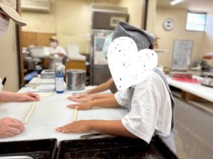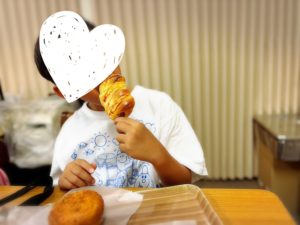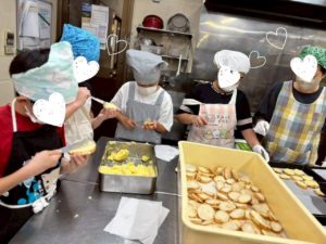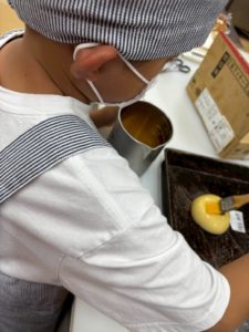ラスクは、たくさんあるフランスパンにシュガーバターをうすーく満遍なく塗るという作業です。「このにおい苦手」という子もいましたが、休憩をすることを促すものの「いや、大丈夫、やりたい!!」と意欲満々!!なので体調と相談しながら進めていきました。