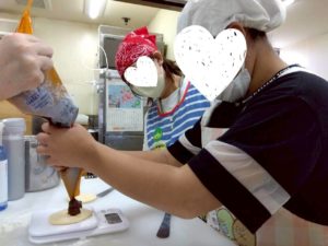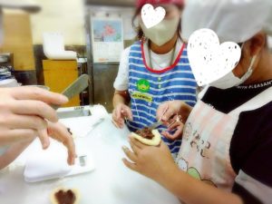 生地にチョコorクリームをヘラを使って溢れないように入れていく作業です。うまくできなくて悪戦苦闘していました!!スタッフも作ってみましたが…難しい!!!「できないー!!チョコが出てくる💦うまく入らない」と作る難しさを実感しました。