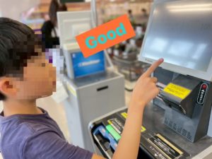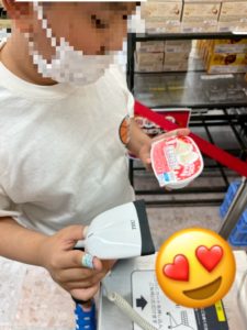 レジでの流れで「挨拶」が、なかなかできない子もいて、促しが必要な子もいたため、レジにお菓子を渡す際の「お願いします」、お会計が終わった後の「ありがとうございました」を伝えていく練習をしていきました。
