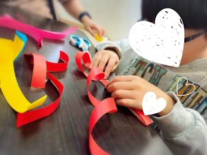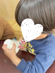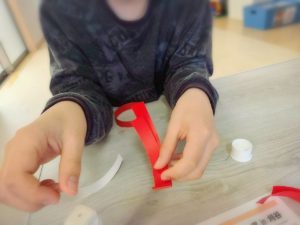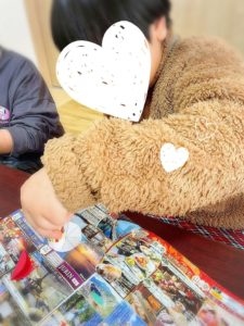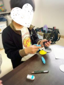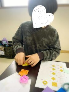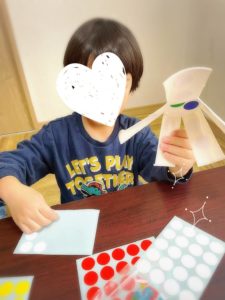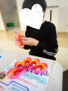 「えーこれ簡単そうに見えてめちゃくちゃ難しいじゃん!!」と見本を見ていっていたり、「一人でじぶんで作れたよ!!」と説明をよく聞いて覚え、スタッフの手を借りずにできたことへ自信とつながっていったり、「かわいくできた♡○○ちゃんの上手!!」などとできたことに達成感を味わえたり、友達の姿を見て褒め合ったりとどの子も楽しく制作することができました☺