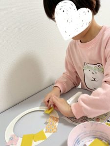 こちらは、紙皿の周りにハサミの一回切りや折り紙をちぎってのりで貼りました。たくさん切っていくことでハサミを使う練習になりました!!