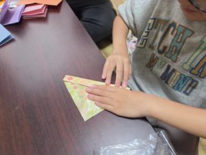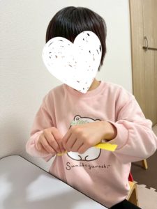 こちらは、折り紙を2枚つなげて2つのじゃばら折りをのりで張り合わせました。じゃばら折りも折り目に沿って折ることがちょっぴり難しい様子。