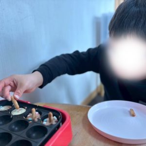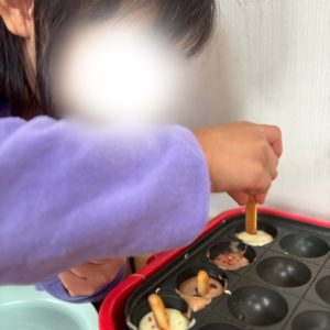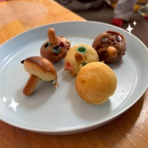 実際は、たこ焼き器にホットケーキの生地を流し込み、チョコやマシュマロを入れて、クッキーをつけて作ります。